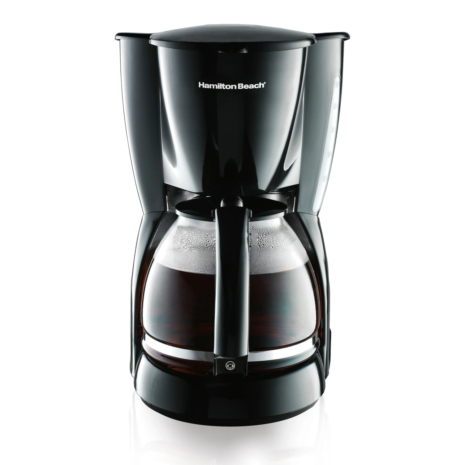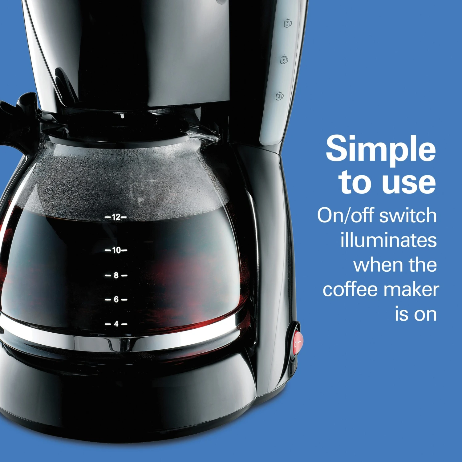 Prepare hot, tasty coffee with this Hamilton Beach 49316 12-cup coffee maker that features a cone-shape brew basket to help extract the flavor. The pause-and-serve function lets you pour yourself a cup while the pot is still brewing. The 12-cup capacity allows you to make enough coffee for a group. A large water window enables fast, easy filling. The nonstick keep-hot plate wipes clean with ease and the filter basket and carafe are dishwasher safe. The lighted button shows when the coffee maker is on and a cord storage will helpto keep your countertops neat.
