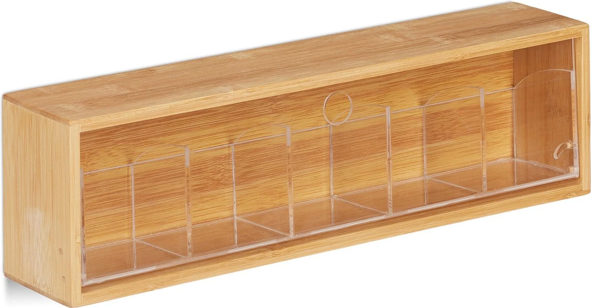 De theedoos van bamboe is de ideale keukenaccessoire voor alle theeliefhebbers! In deze praktische opbergdoos voor thee kun je al je favoriete theesoorten droog en met behoud van aroma bewaren. In de 5 ruime vakken van het theedoosje passen ongeveer 10 theezakjes per compartiment. Dankzij de transparante deksel heb je altijd een goed overzicht over de theesoorten. De houder voor theezakjes wordt ruimtebesparend aan de wand gemonteerd waardoor je altijd snel bij je thee kunt komen.