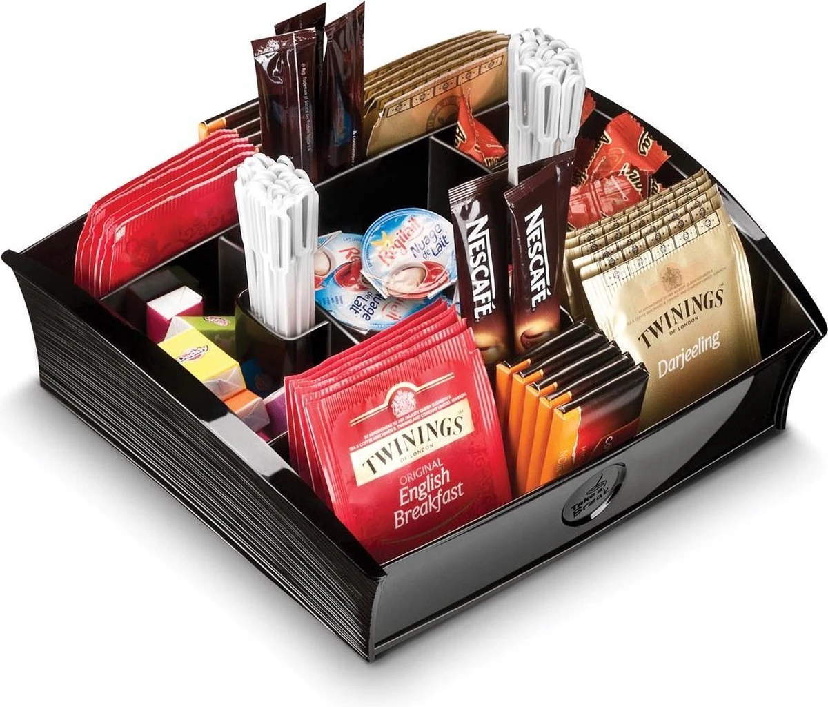 Dit bakje is handig, discreet en stijlvol en is onmisbaar tijdens uw vergaderingen en koffie- en theepauzes. Geschikt voor het opbergen van theezakjes, papieren en plastic bekers, roerstaafjes, servetten en andere kleine voorwerpen zonder dat u uw vergadering hoeft te verlaten. Zo neemt u gemakkelijk alles mee wat u nodig hebt om koffie of thee te maken tijdens vergaderingen en pauzes. Dit bakje is gemaakt van recyclebaar polystyreen en is stevig, duurzaam en milieuvriendelijk.